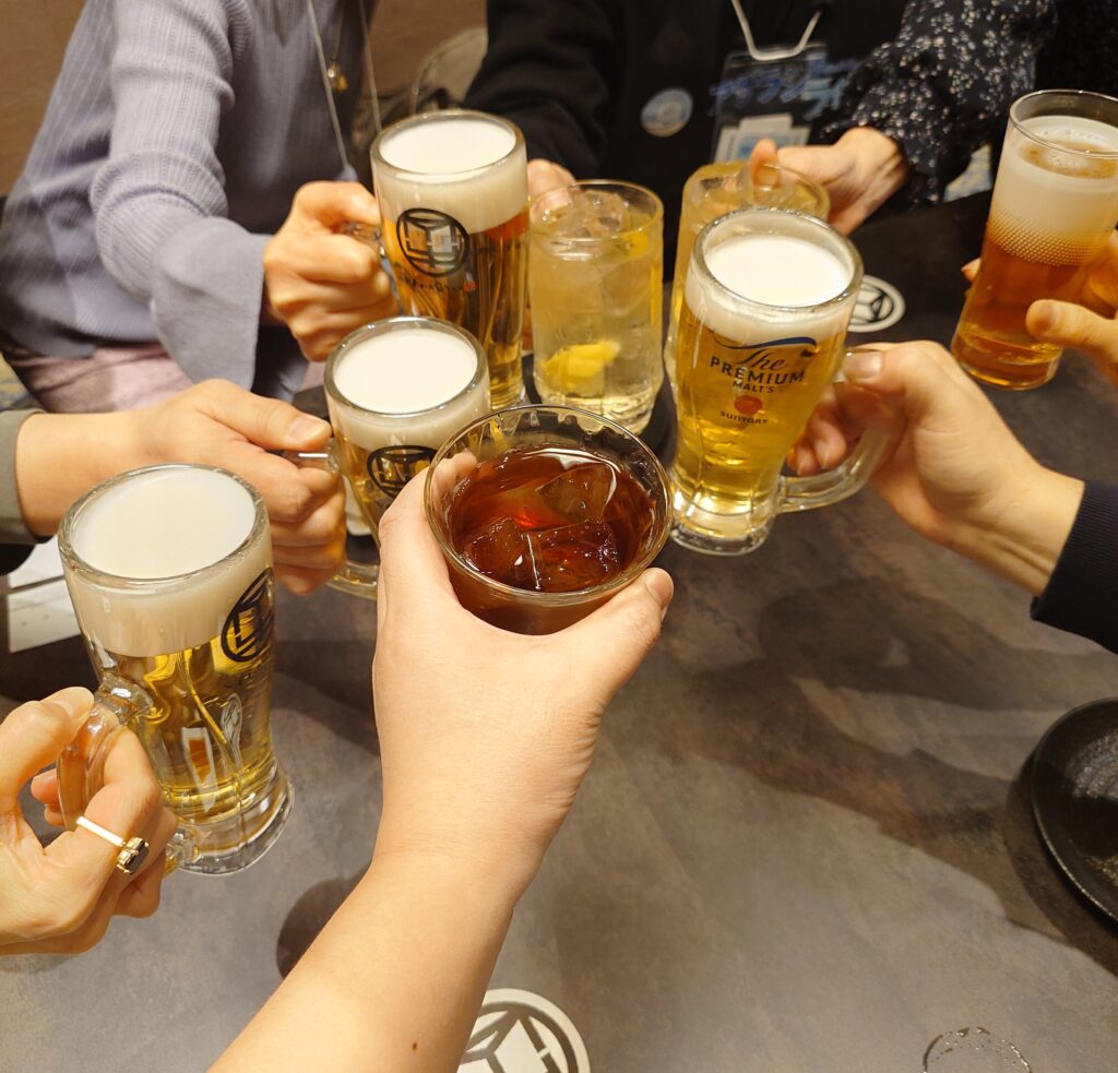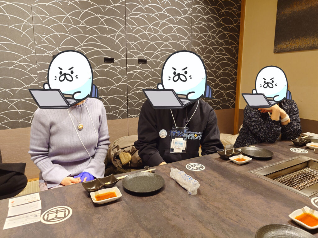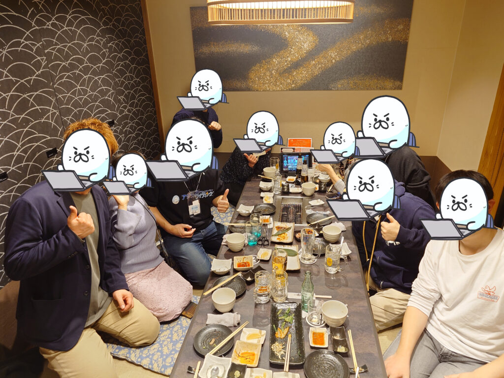 あっという間に時間が過ぎ、気づけばラストオーダーの時間に。 楽しい時間ほど早い、とはよく言いますが、本当にそうでした。 まだまだ話し足りないところでしたが一次会はお開きに。 集合写真も撮って、改めて楽しい会だったな、来てよかったな、と思いました。 お会計ですが、飲み放題でさらに極上のお肉をいただいたのに、アザラシライティング塾から交流会補助金1人あたり4000円が出たので、驚くほど格安でした!